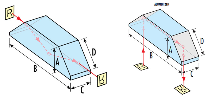 道威棱镜是不加涂层的、采用增透膜的对角面,或是镀铝的对角面。镀铝膜的道威棱镜,采用保护性铝膜,并在对角面上涂黑漆,非常适合用于转移反射。可U型转弯入射激光光束。